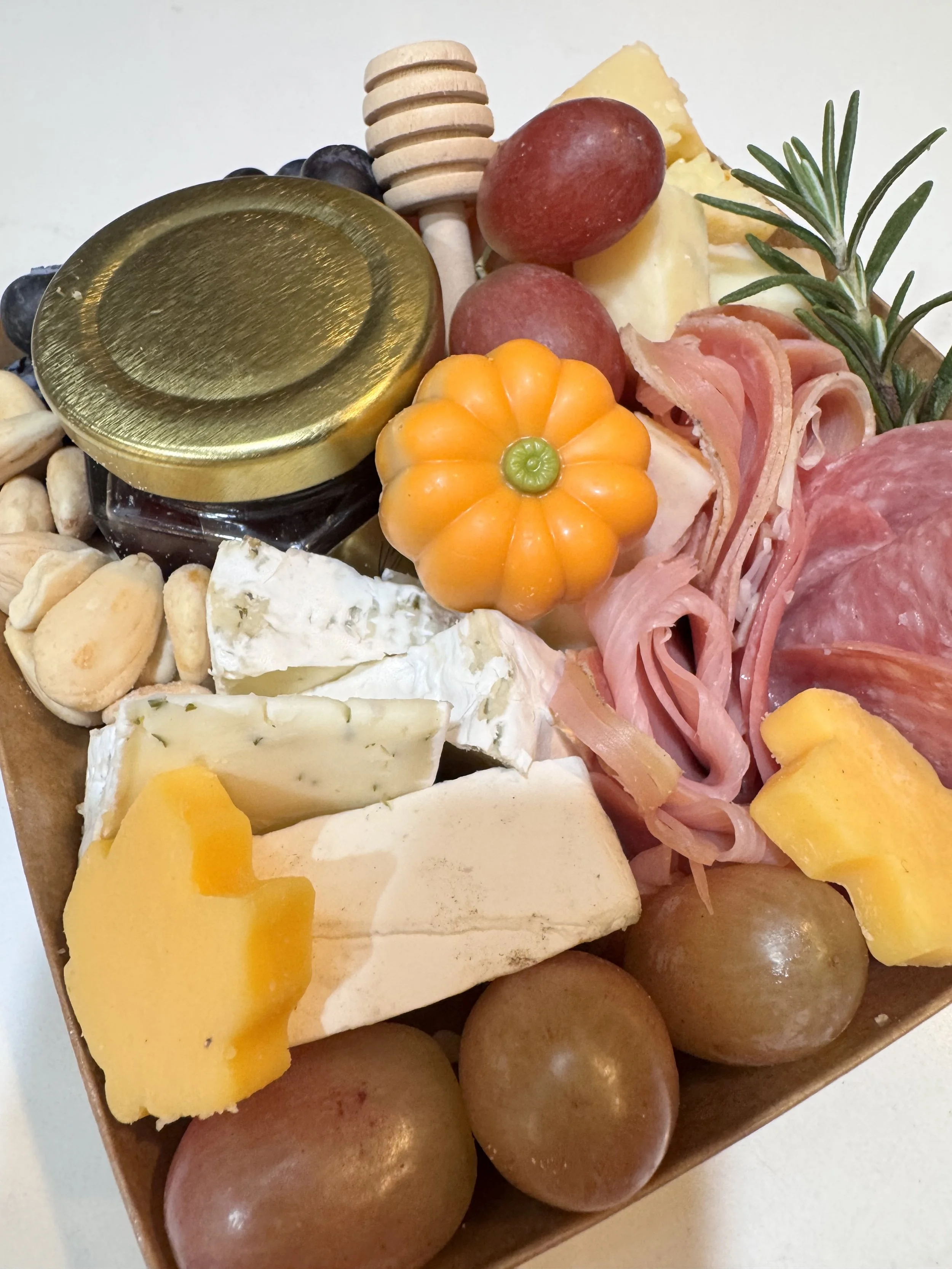 The Bitty Box serves 1 as a meal and 2 as a snack and is perfect for a bachelorette in wine country, group events, and employee appreciation. This box features at least 1 cheeses, 1 meat, seasonal fruits, marcona almonds, crackers and some sweet & tangy whimsy.